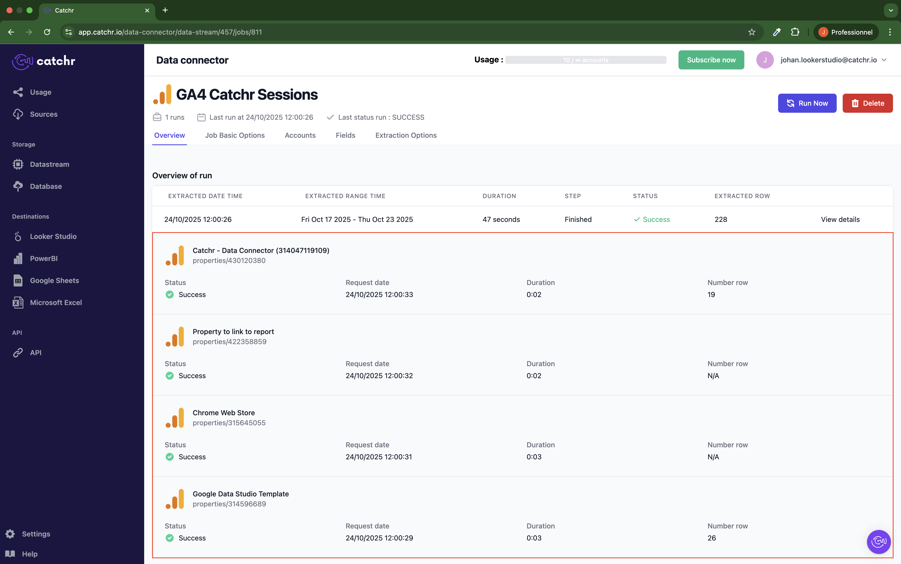 This opens a detailed view showing every account involved in that specific run. For each account, you’ll see: