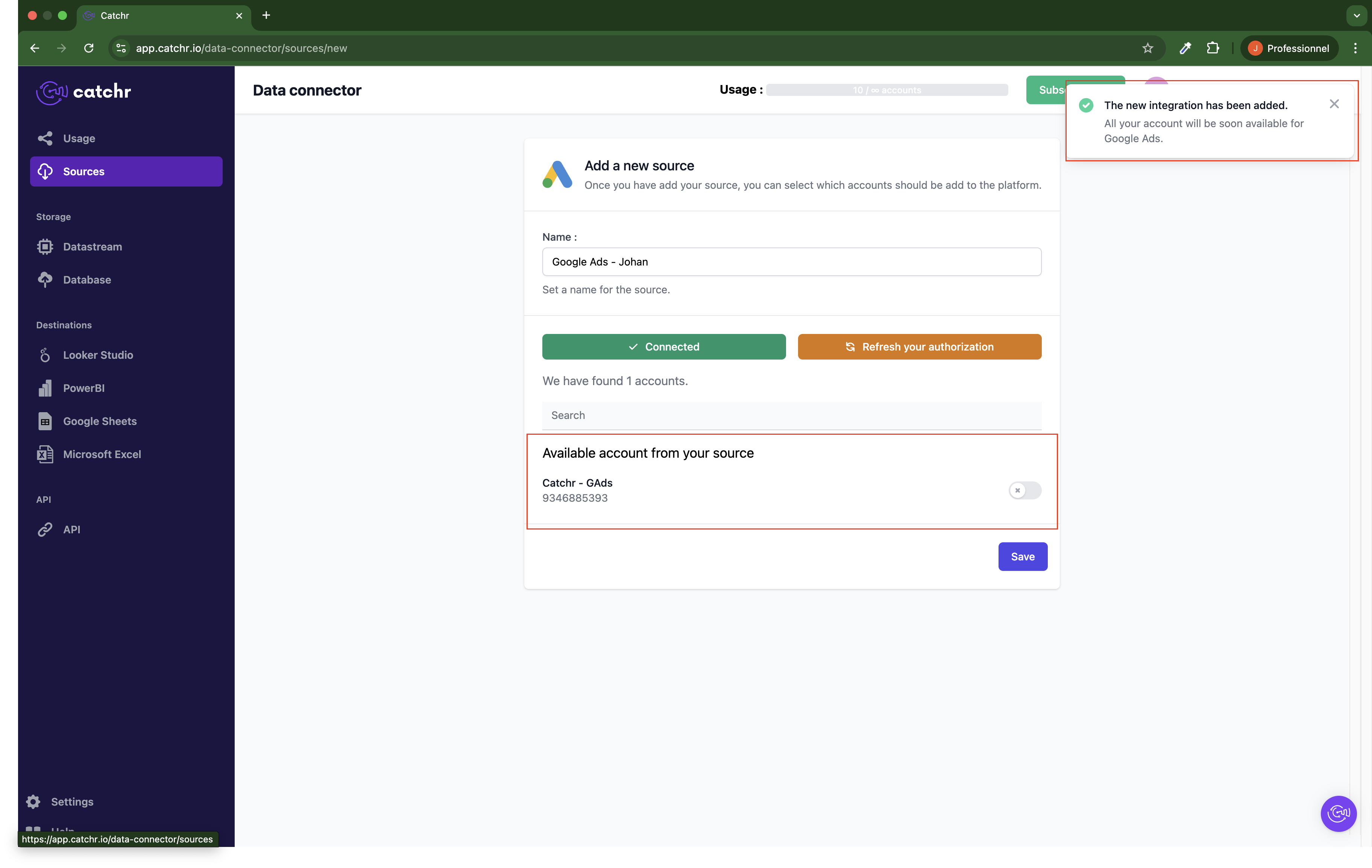 You can now send data from your available accounts to one of Catchr's supported destinations, such as databases or visualization tools like Looker Studio, Google Sheets, Excel, Power BI, or Tableau.