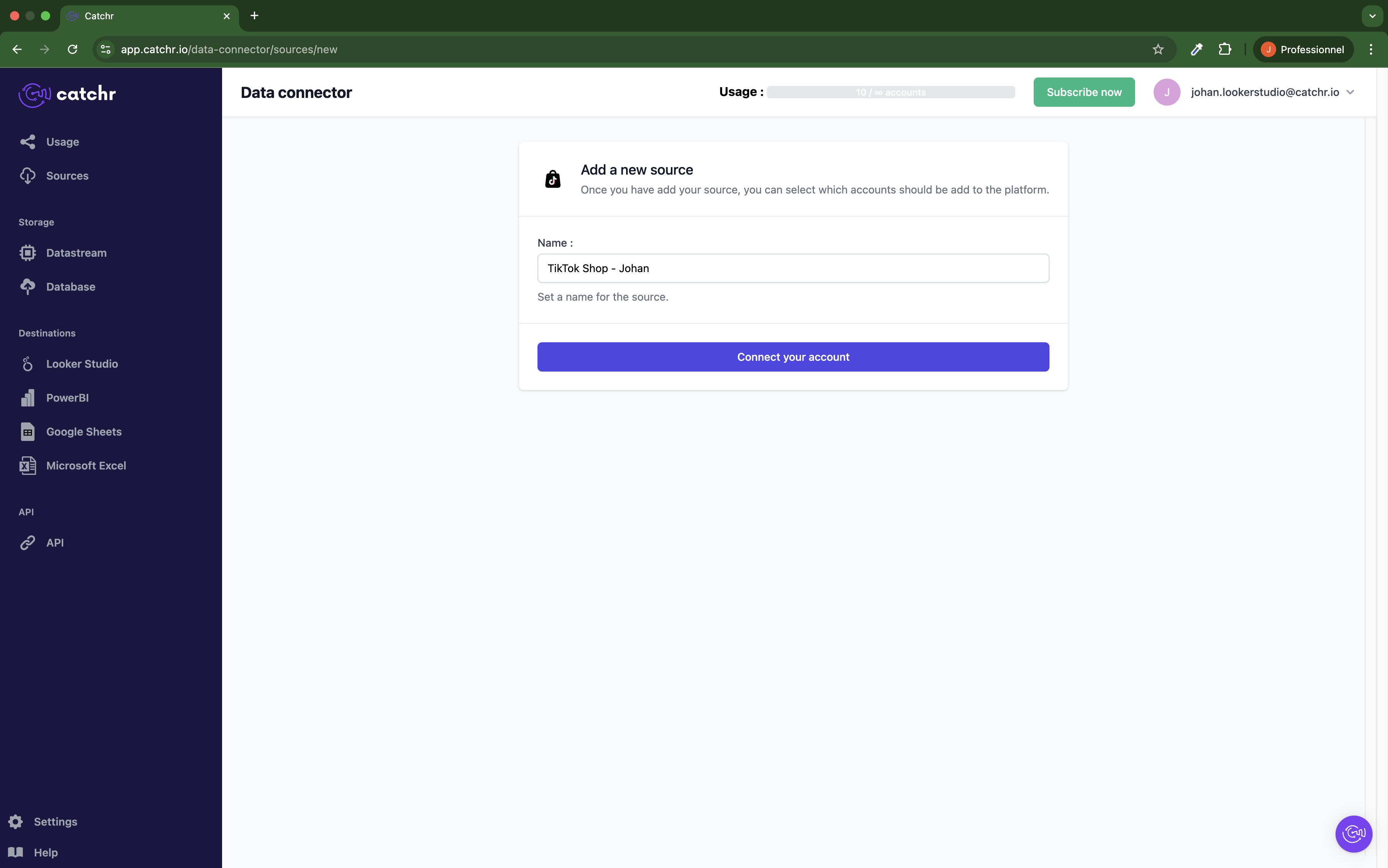 Name your Source on Catchr and click Connect your account (the name is available in the Source list on Catchr). We advise naming it with TikTok Shop - [Catchr username].