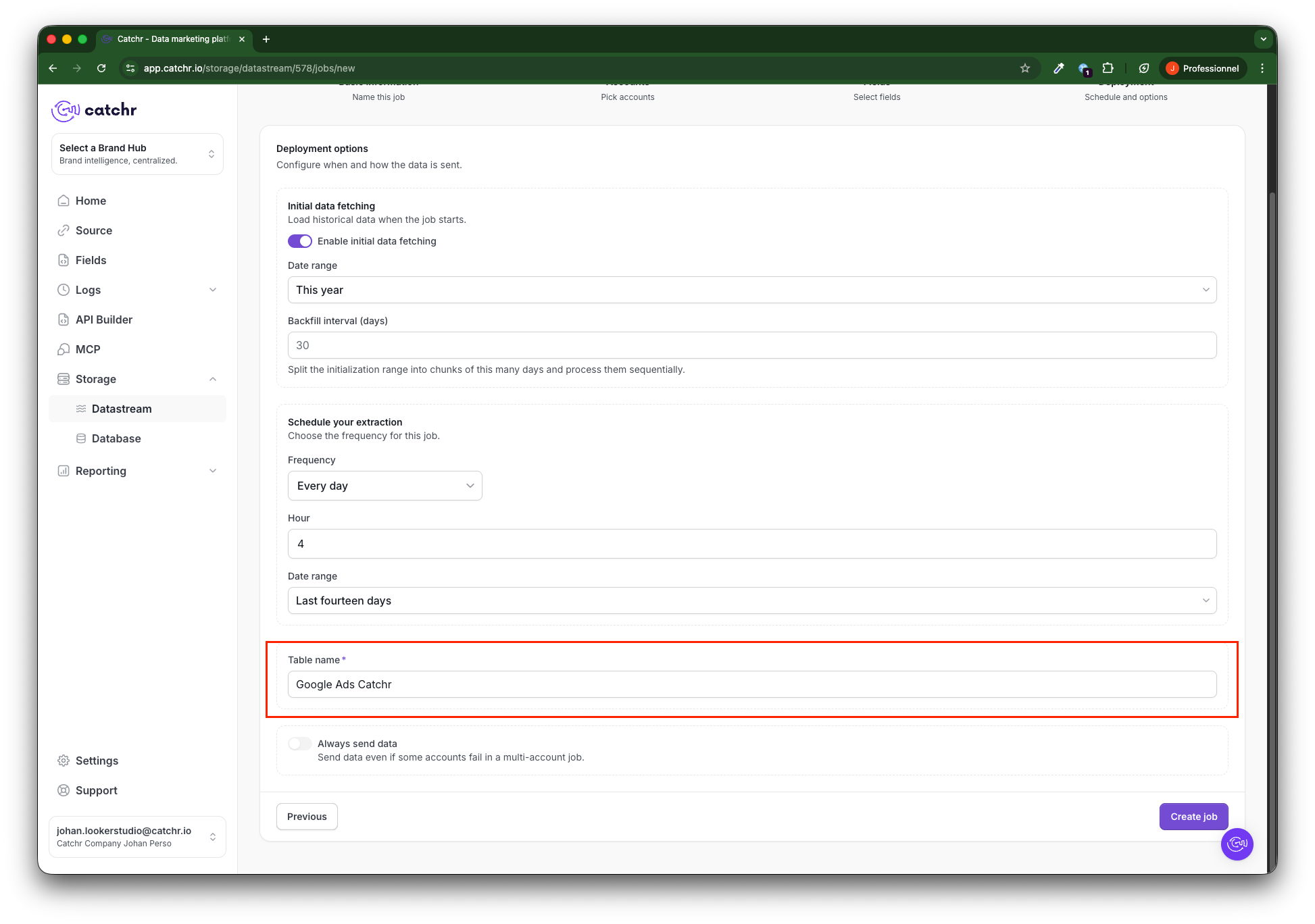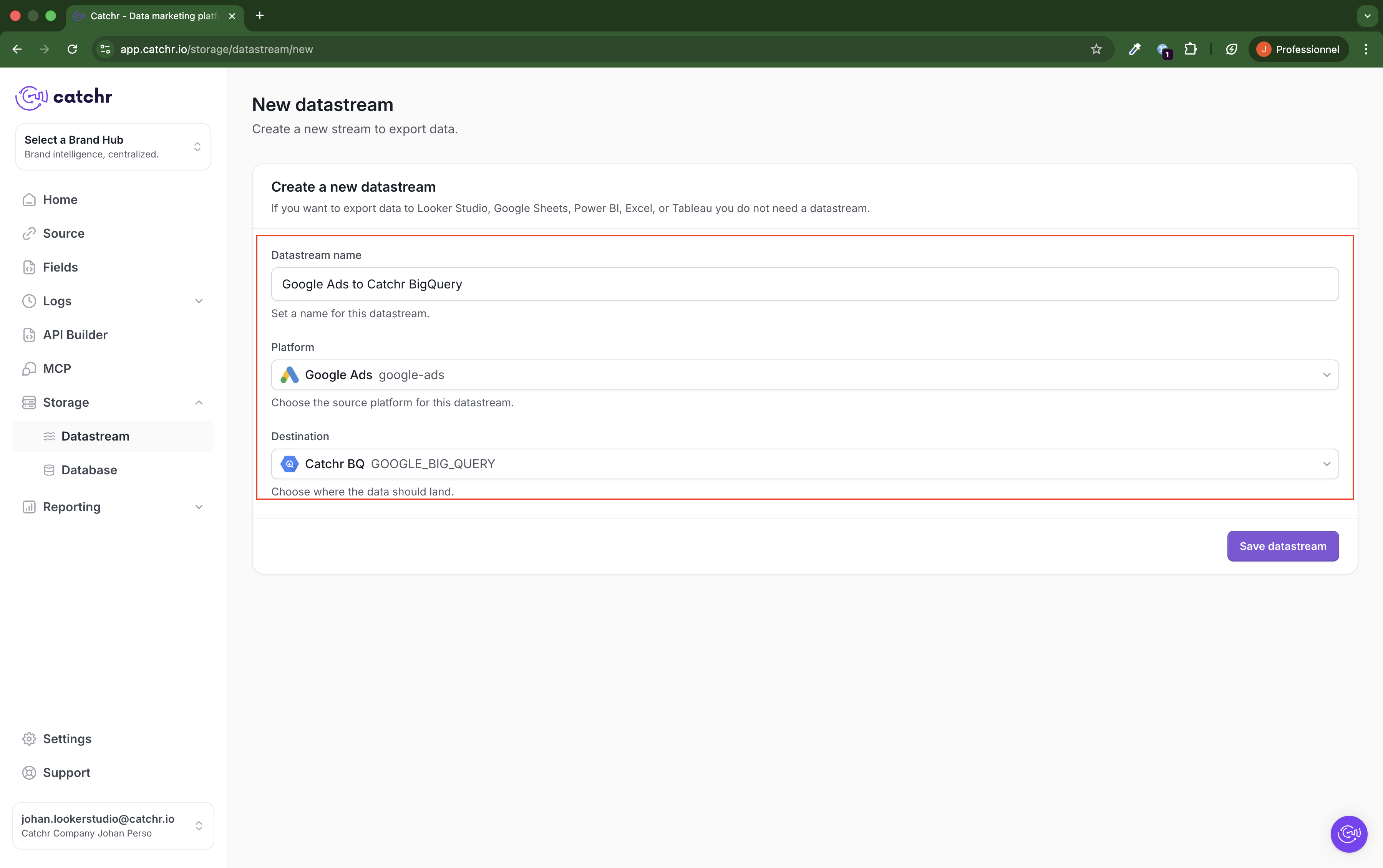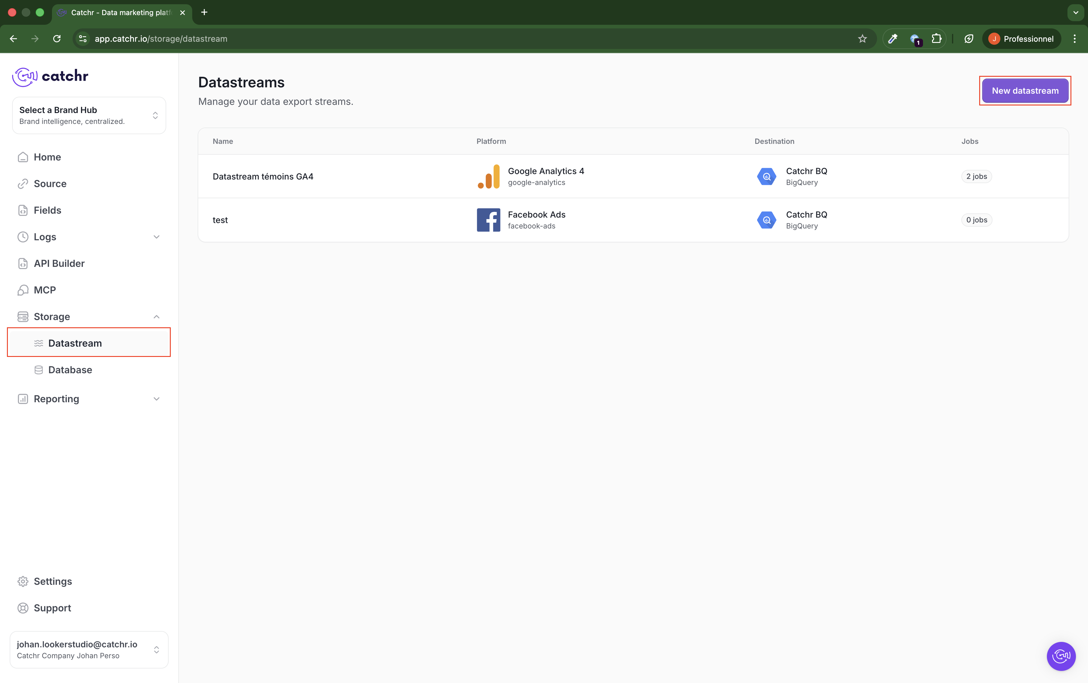 Go to app.catchr.io and open the Datastream menu in Storage.
