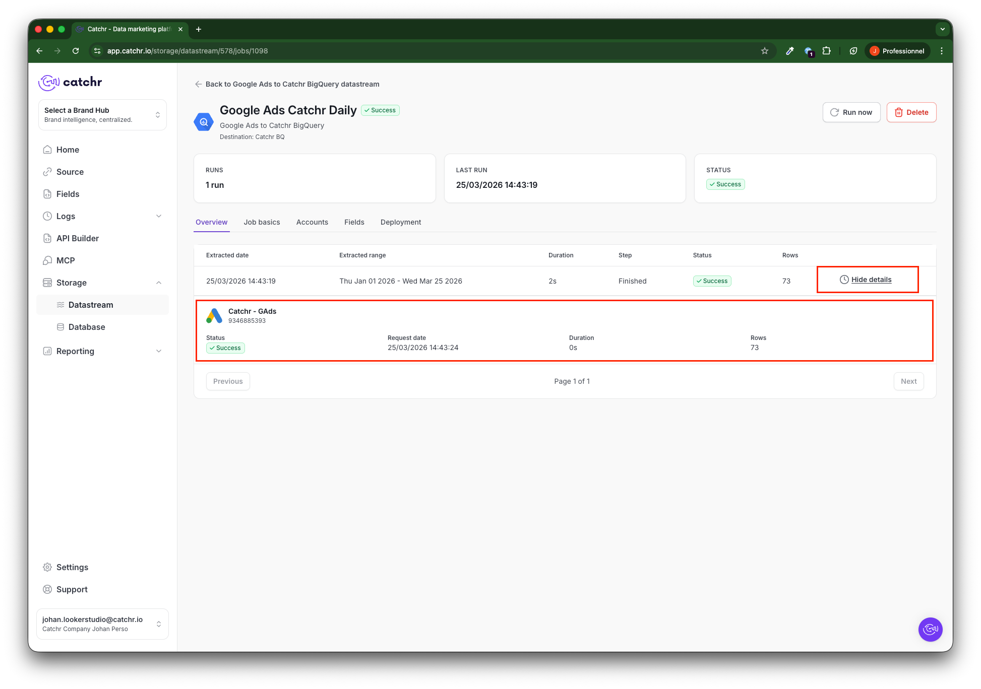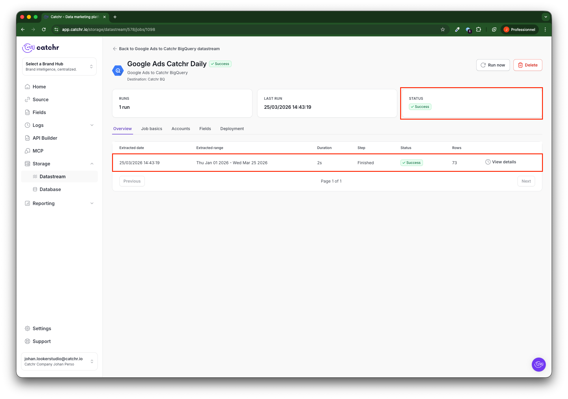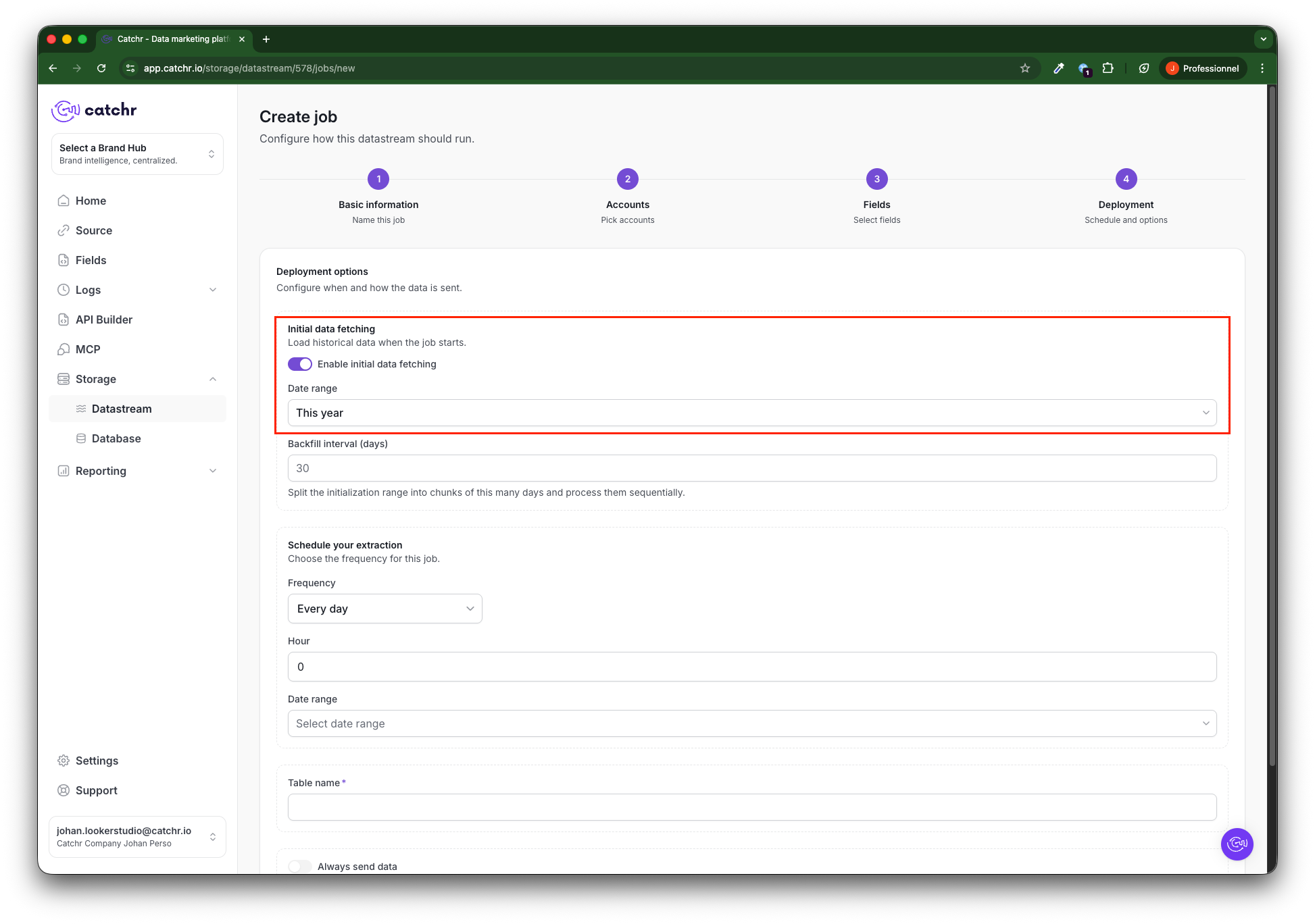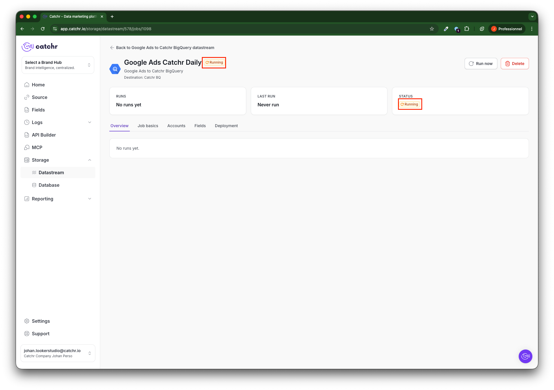 Your job will now launch the initial fetching. It will have a Running status until it finishes (depending on the period selected during the initial fetch, this can take several hours).