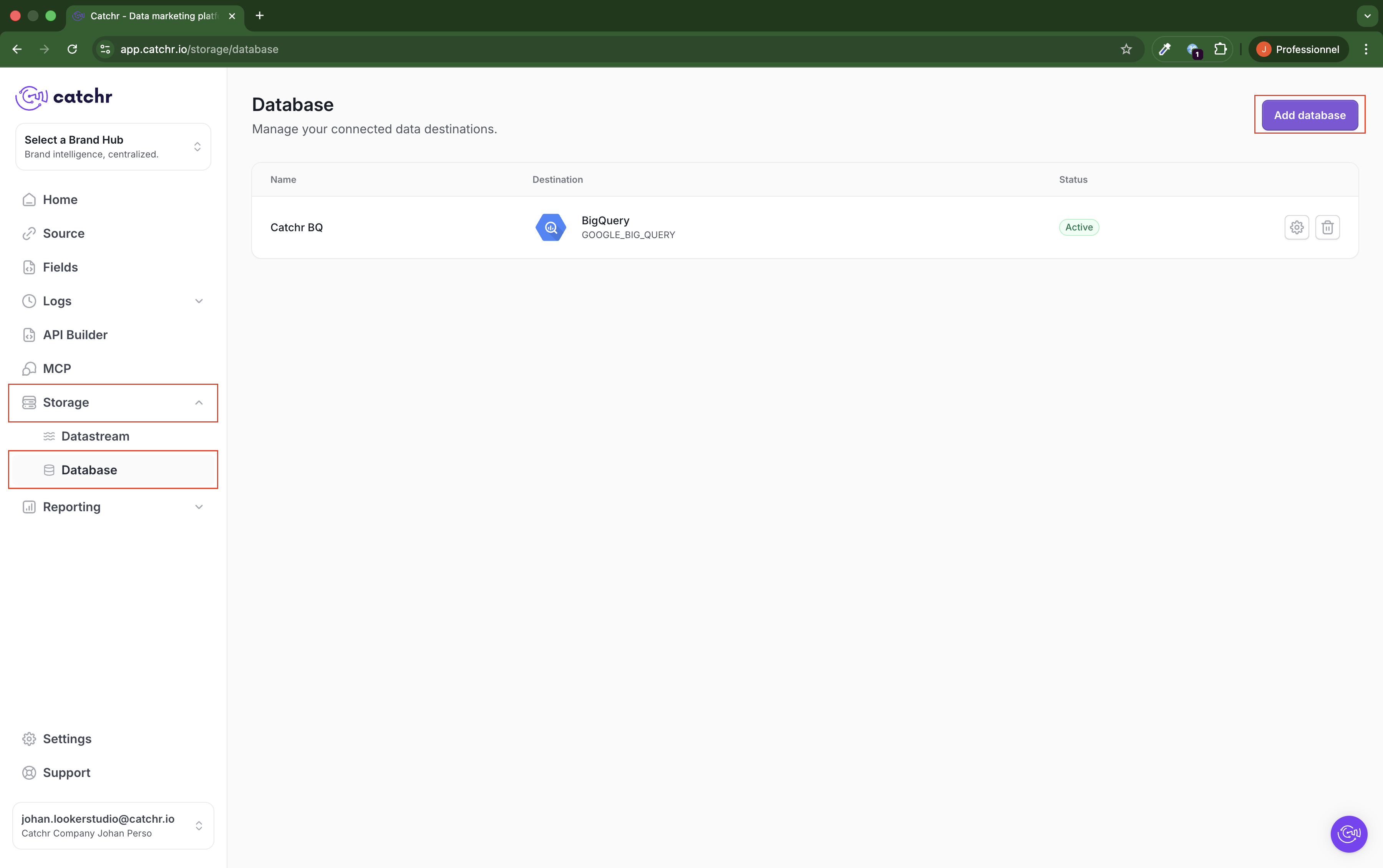 Go to app.catchr.io and open the Database menu in Storage