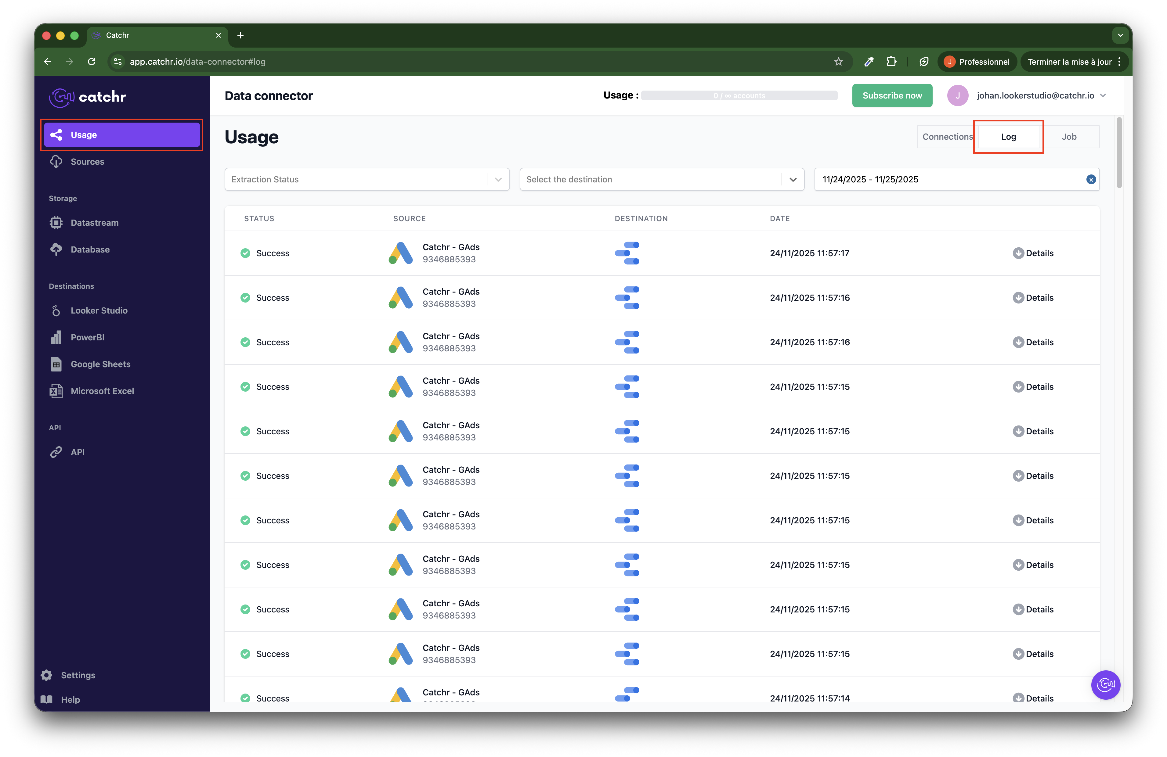 Go to https://app.catchr.io/data-connector → Log.