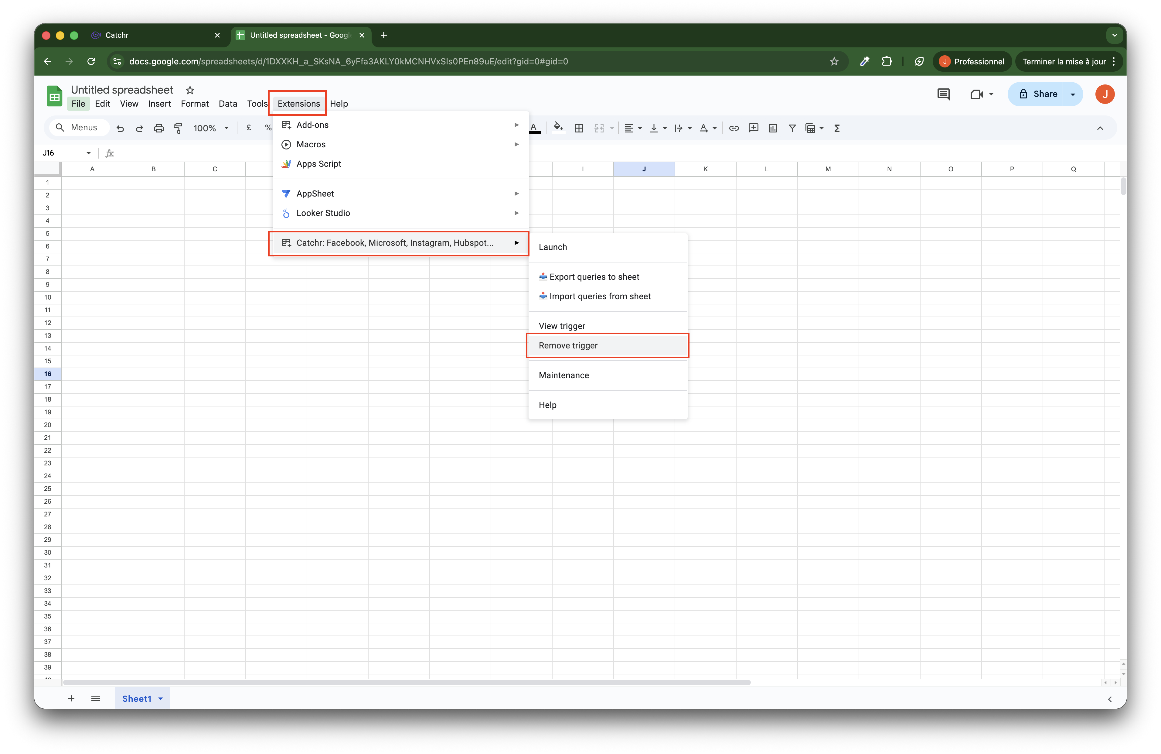 Go to Extensions → Catchr Add-on → Remove trigger.