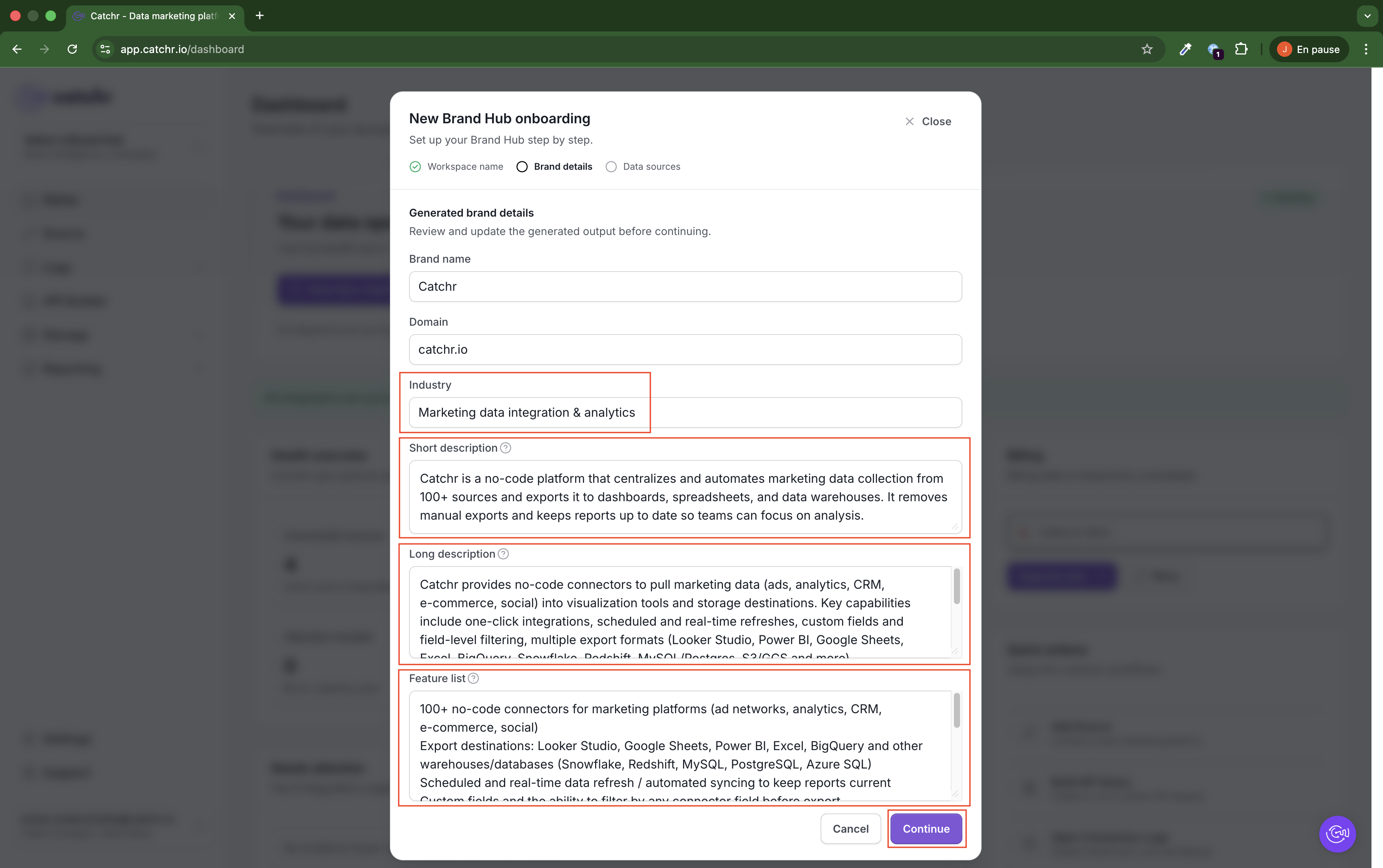 Review and edit these fields if needed, then click Continue.