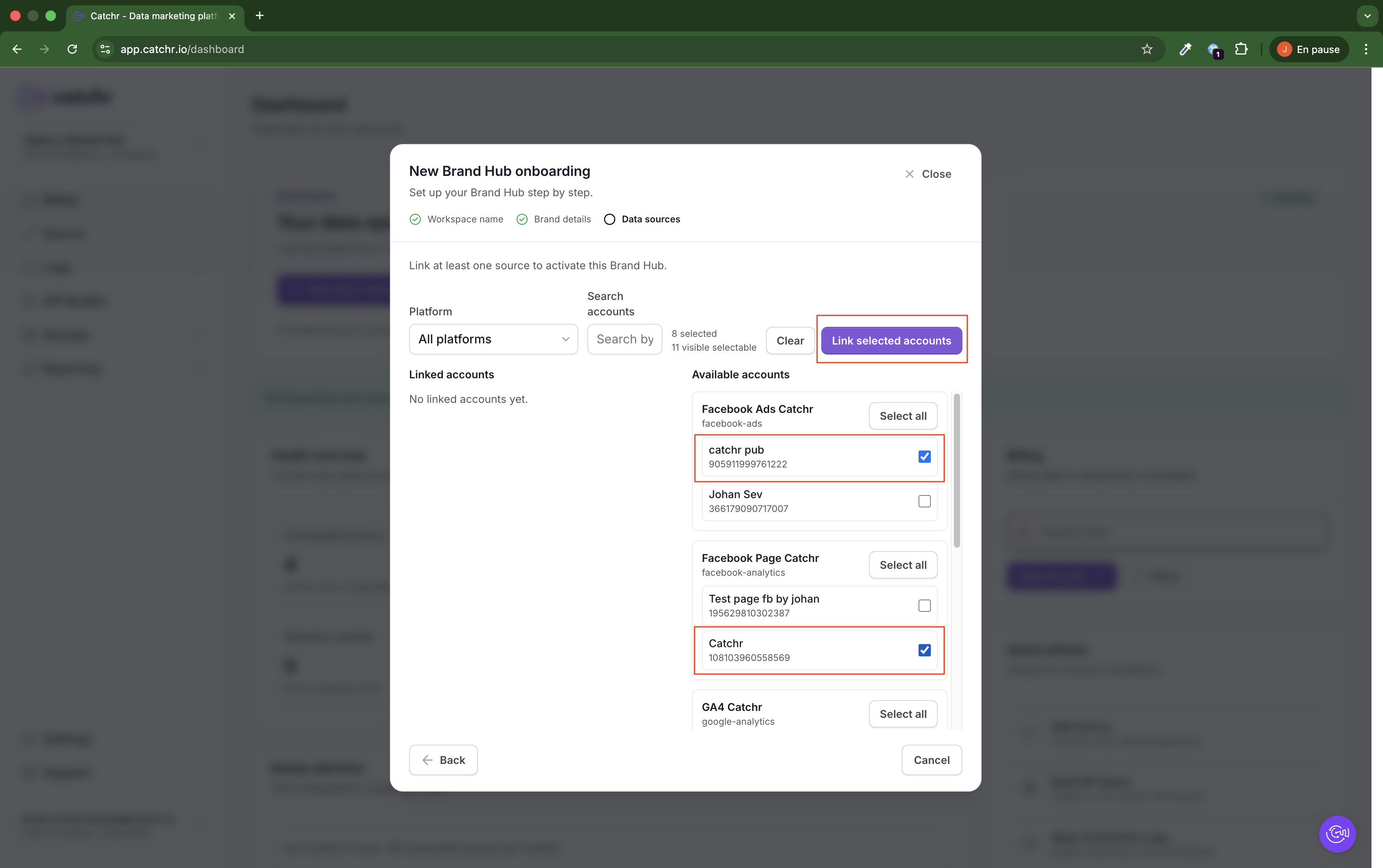 Select one or more accounts in Available accounts, then click Link selected accounts.