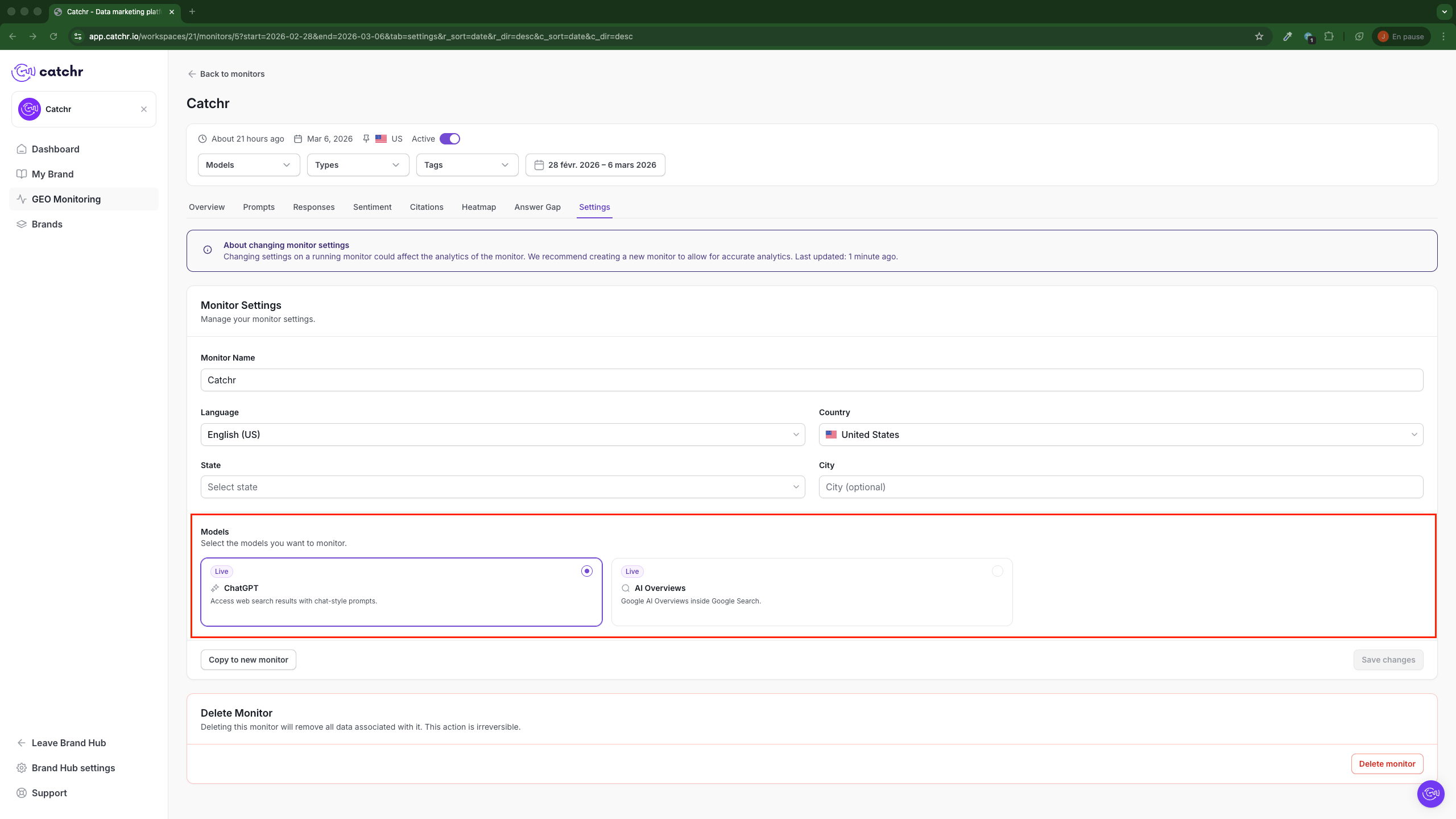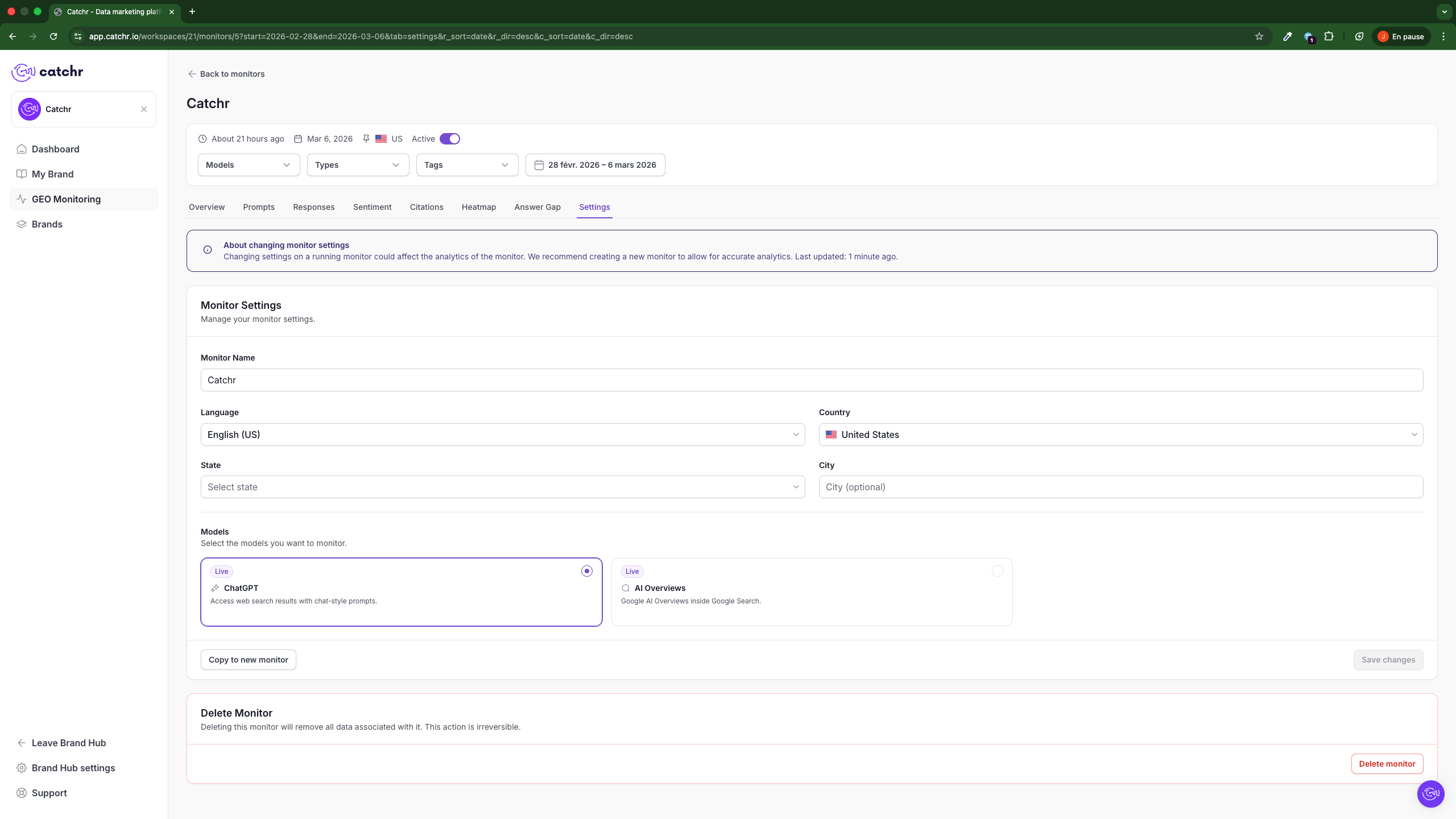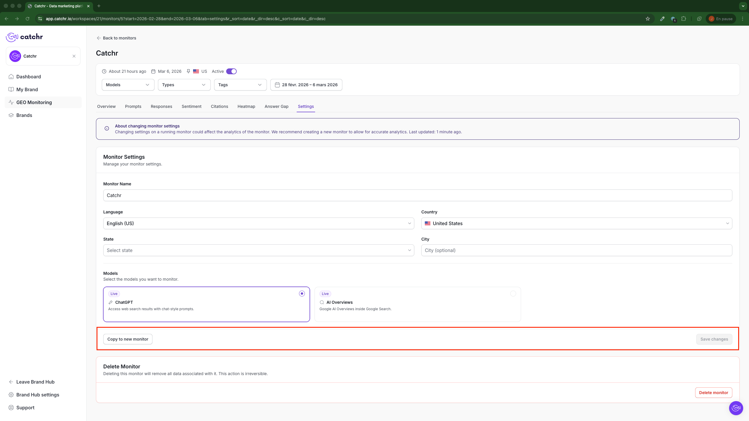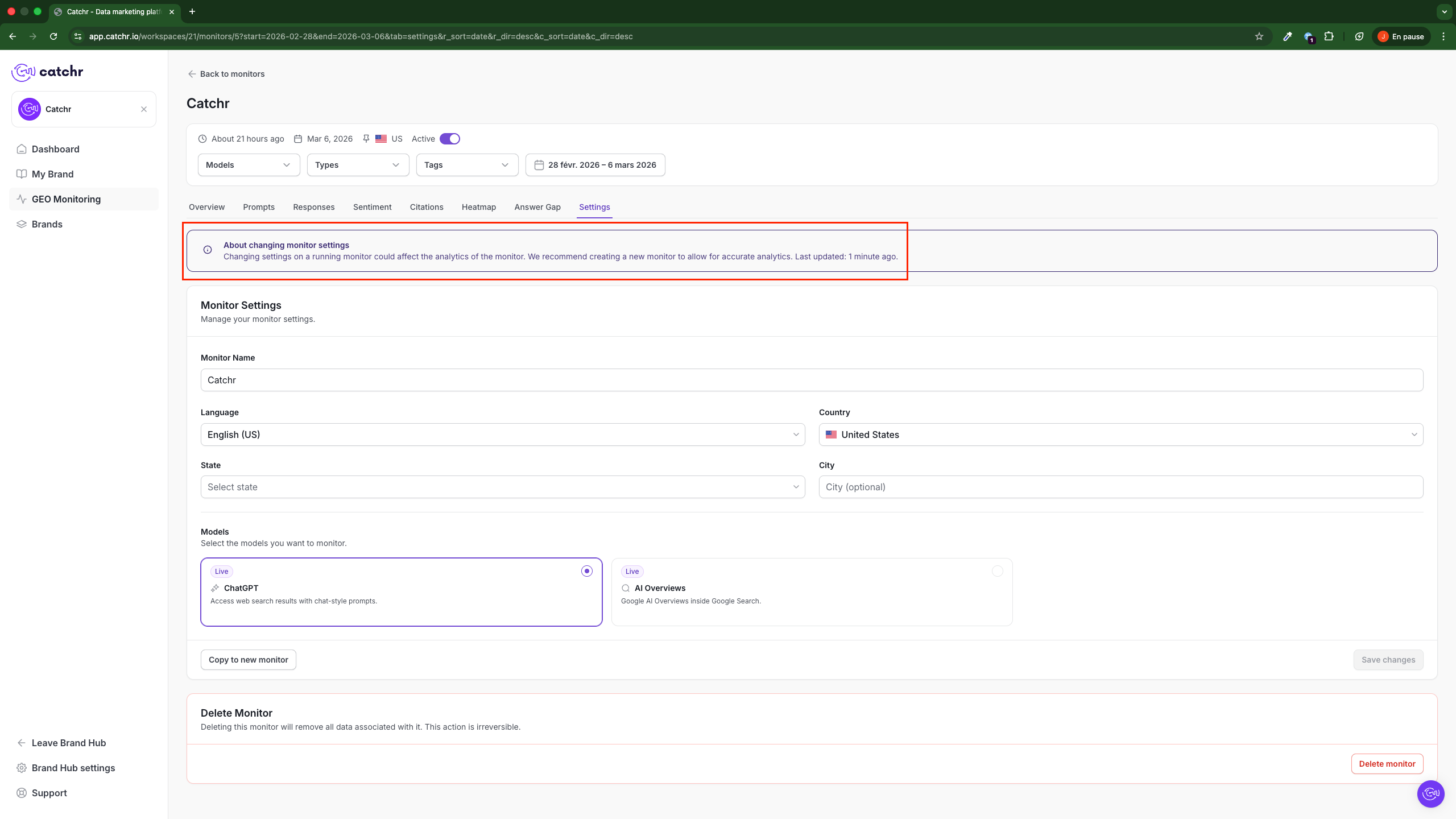 This warning explains that editing a running monitor can affect analytics. When you want to preserve historical accuracy, GEO recommends creating a new monitor instead of modifying the current one.