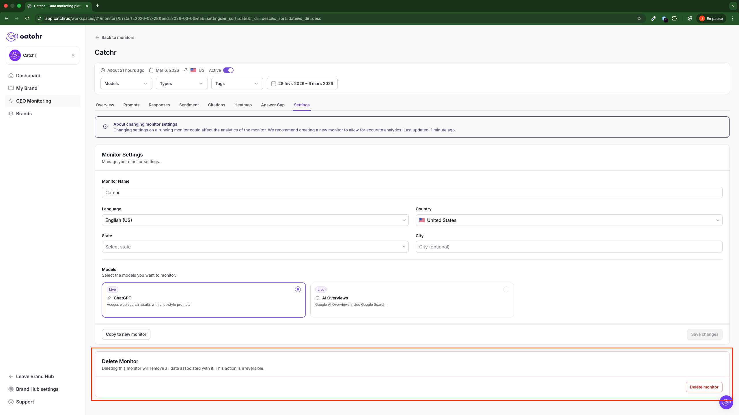 The warning in this section states that deleting the monitor will remove all data associated with it and that this action is irreversible.