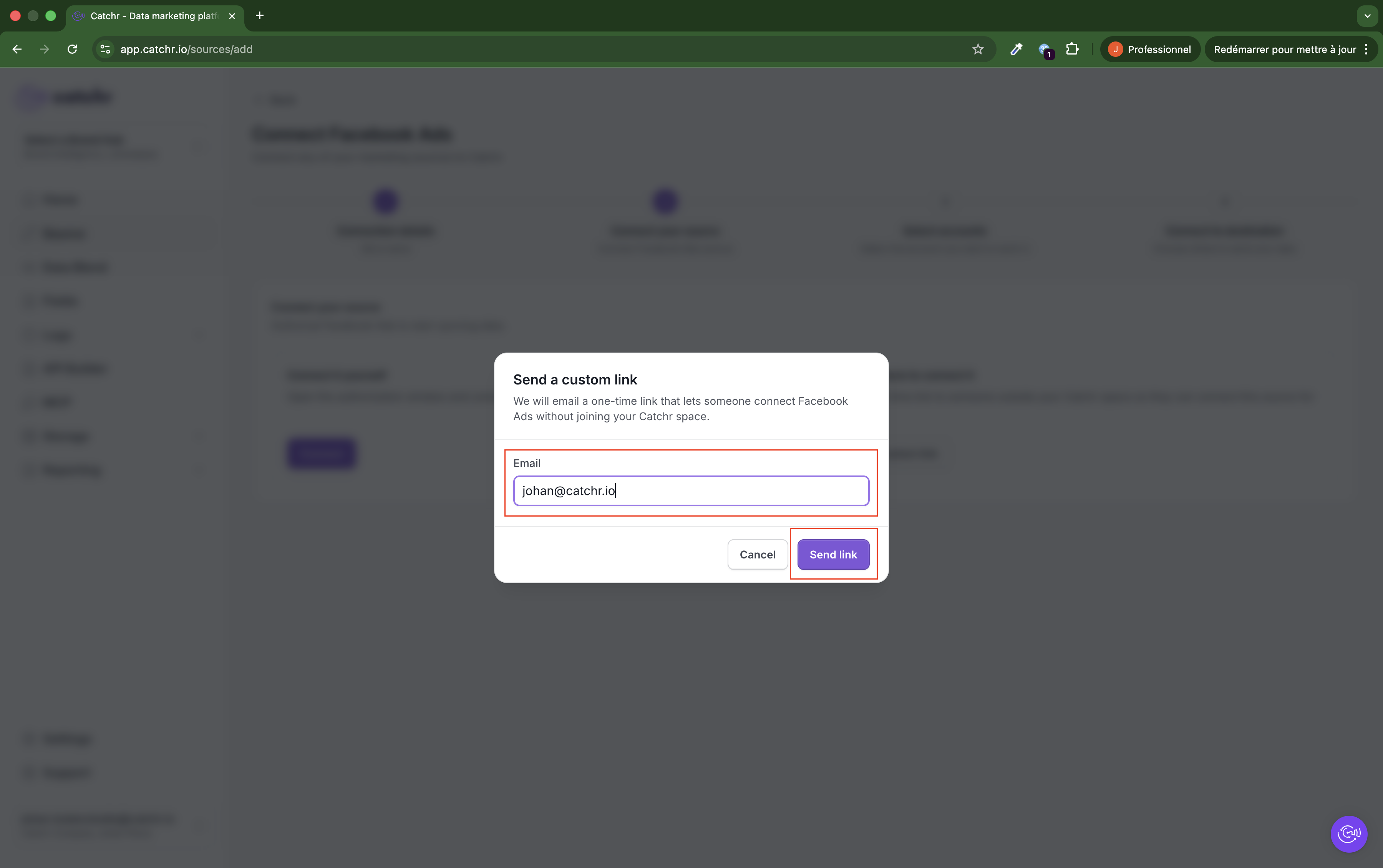 Enter the email address of the person who should connect the source, then click Send link.
