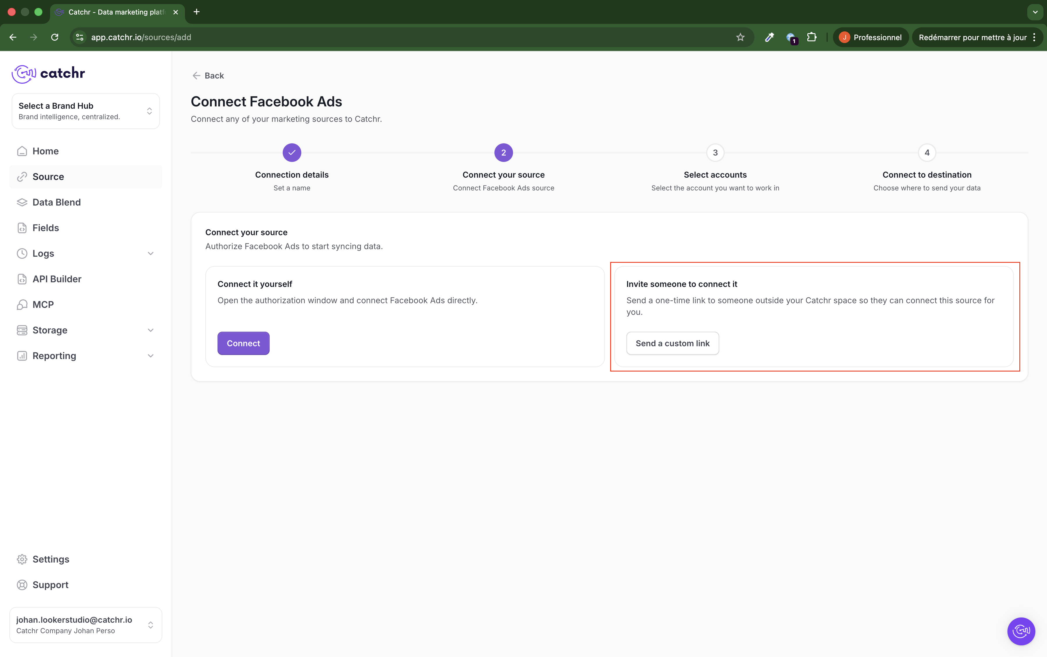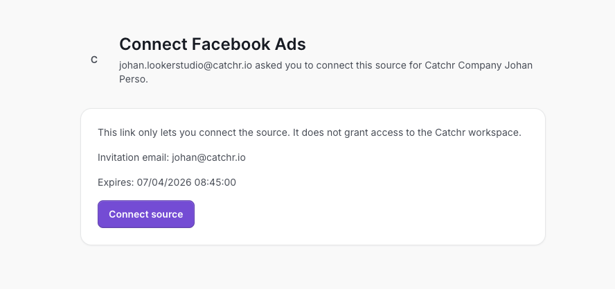 This is especially useful for agencies that need clients to connect their own ad, analytics, ecommerce, or social accounts without giving them access to the Catchr workspace.