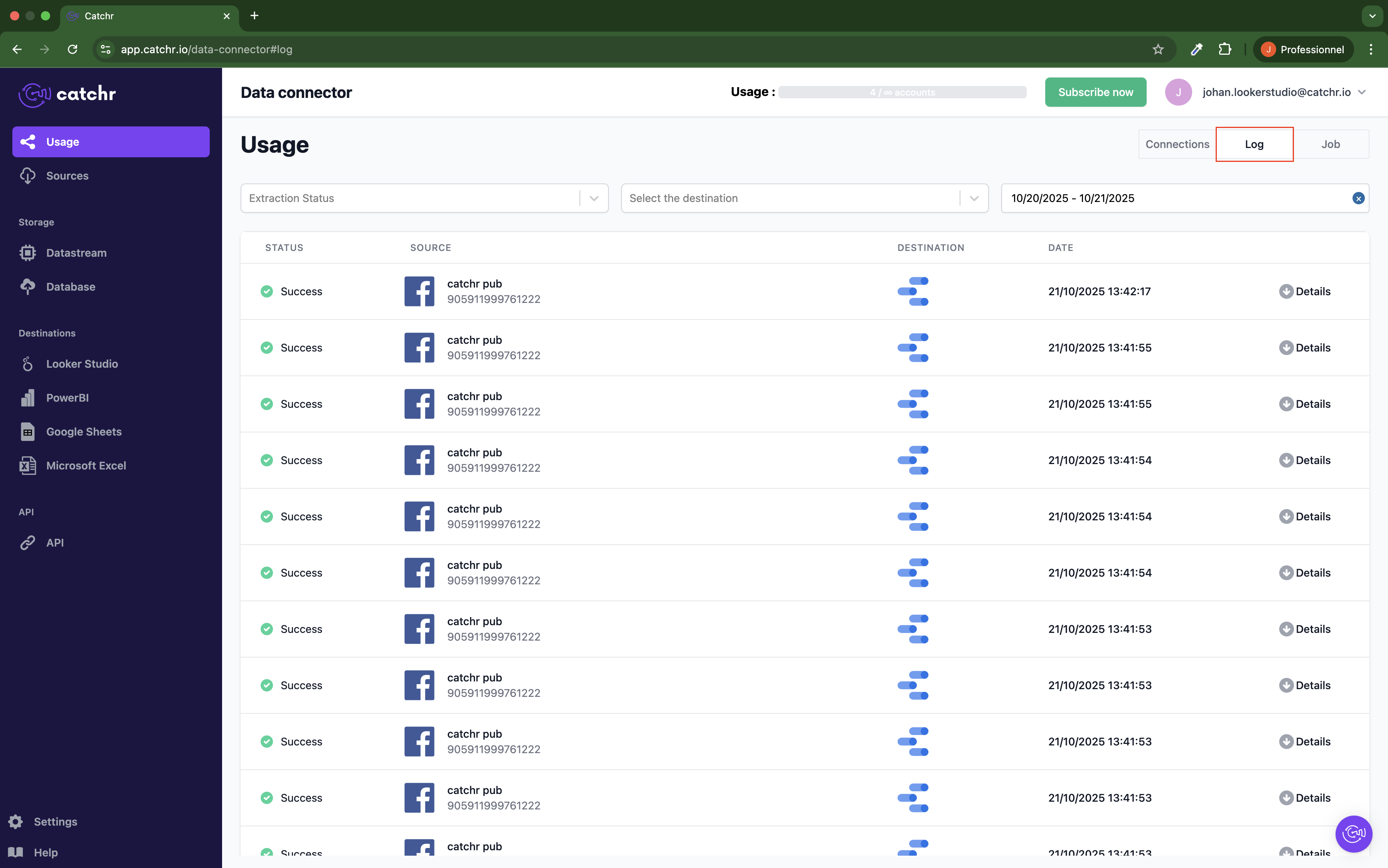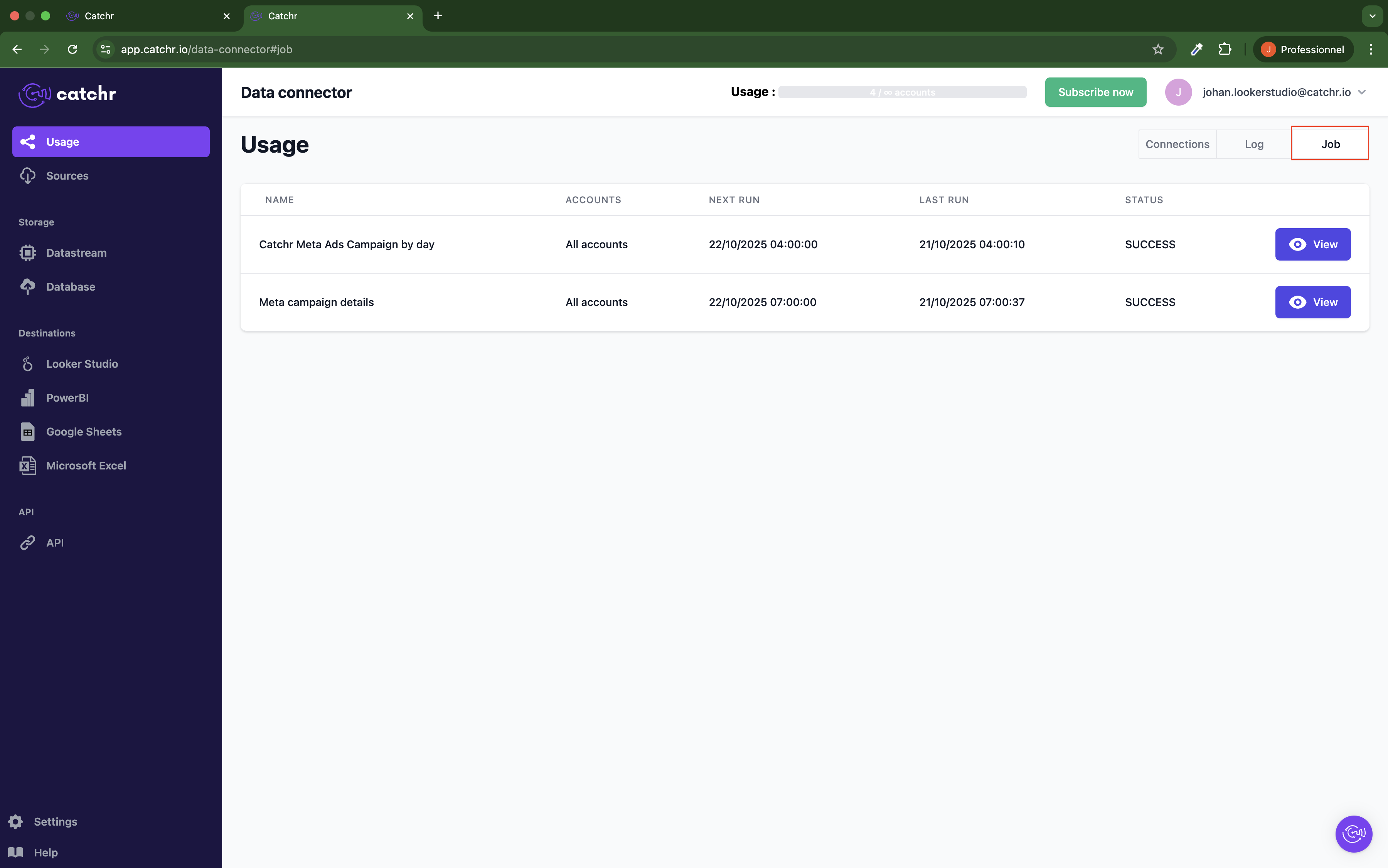 The Usage section in Catchr helps you monitor all activity related to your data connections, queries, and automated jobs. This feature clarifies how your Catchr account interacts with different data sources and destinations, making it easy to manage usage and understand your billing.