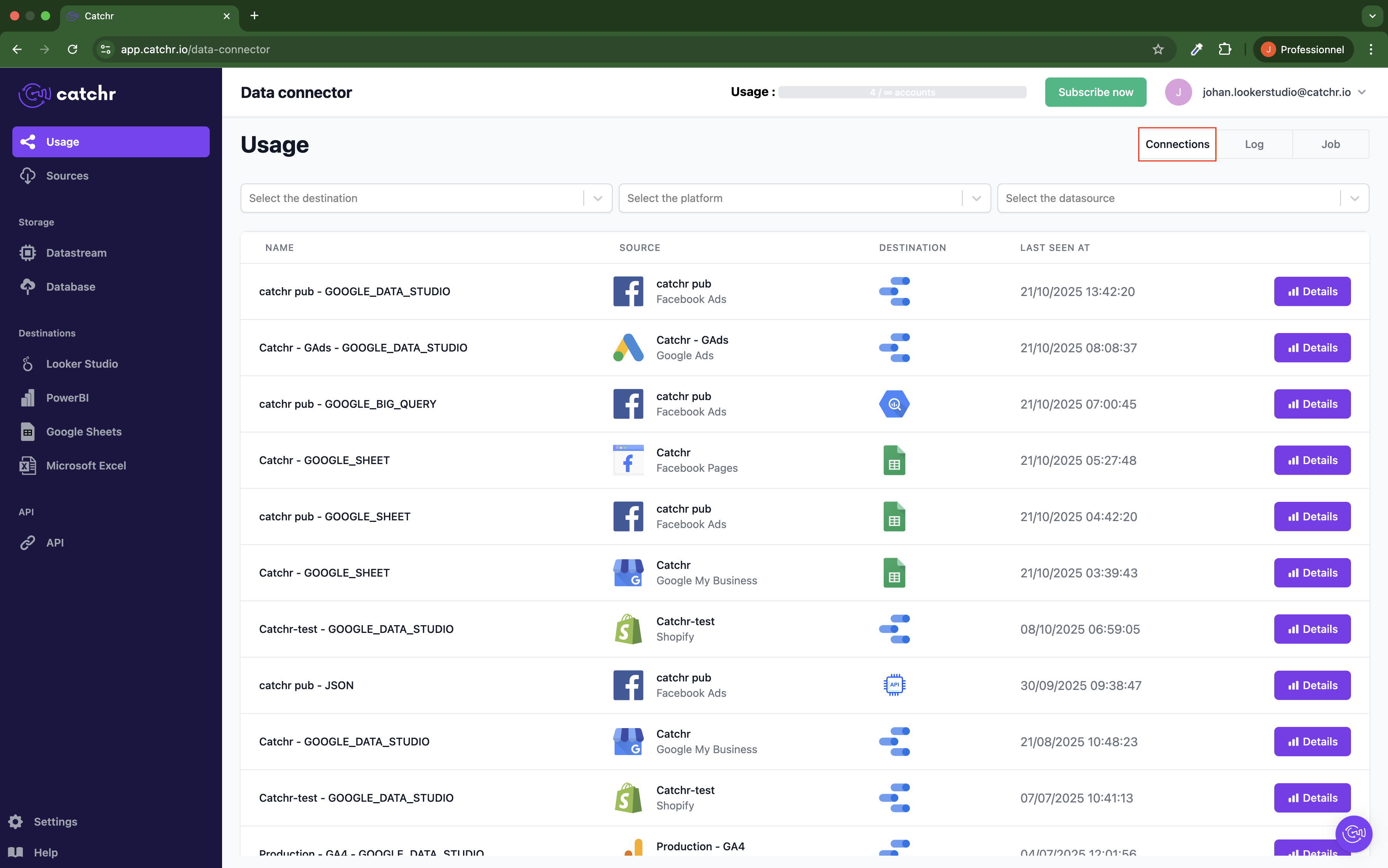 The usage section allows you to easily track how your data flows through Catchr, monitor performance, identify issues, and ensure efficient use of your connections and queries.