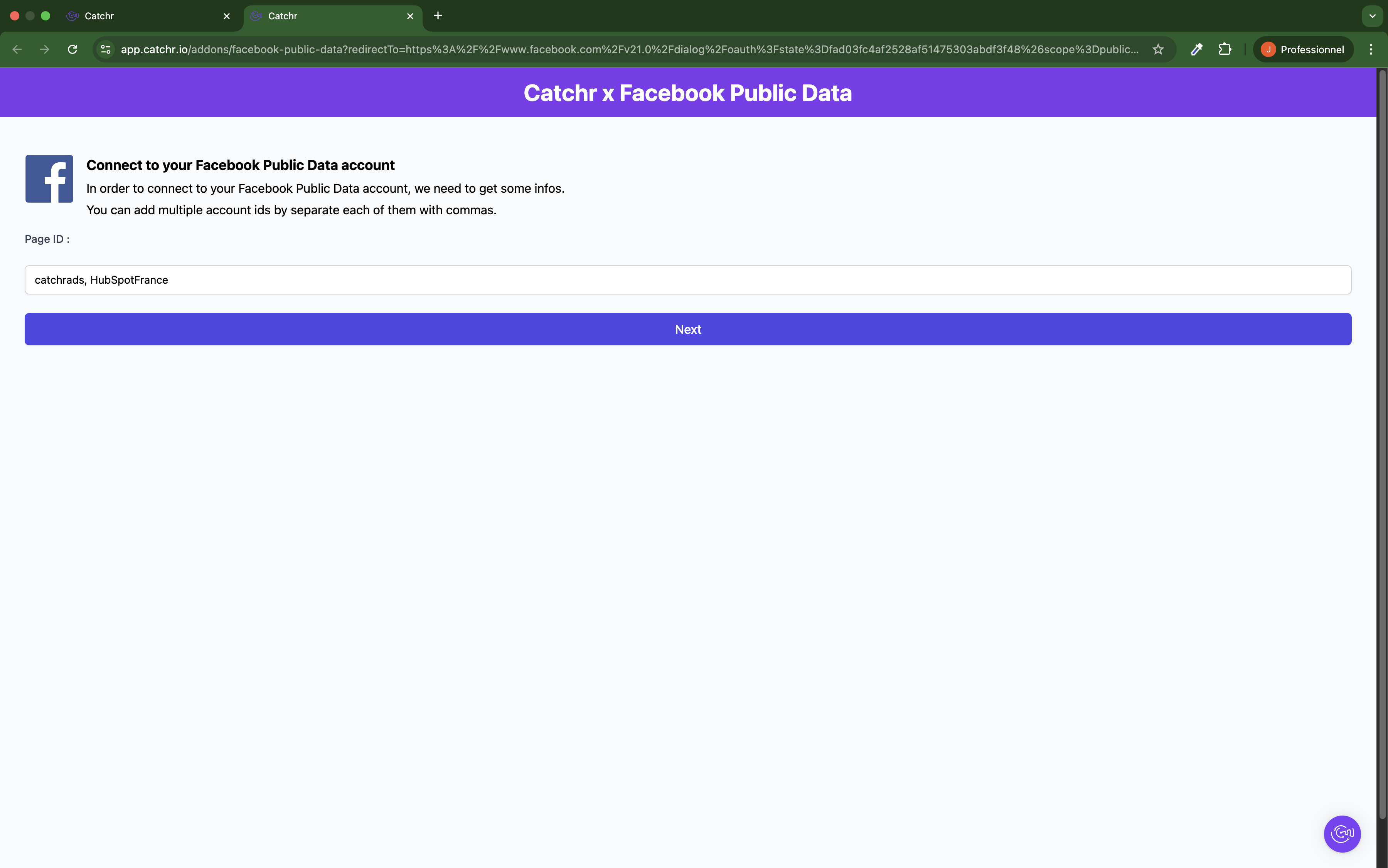 Name your Source on Catchr and click Connect your account (the name is available in the Source list on Catchr). We advise naming it with Facebook Public Data - [Catchr username].