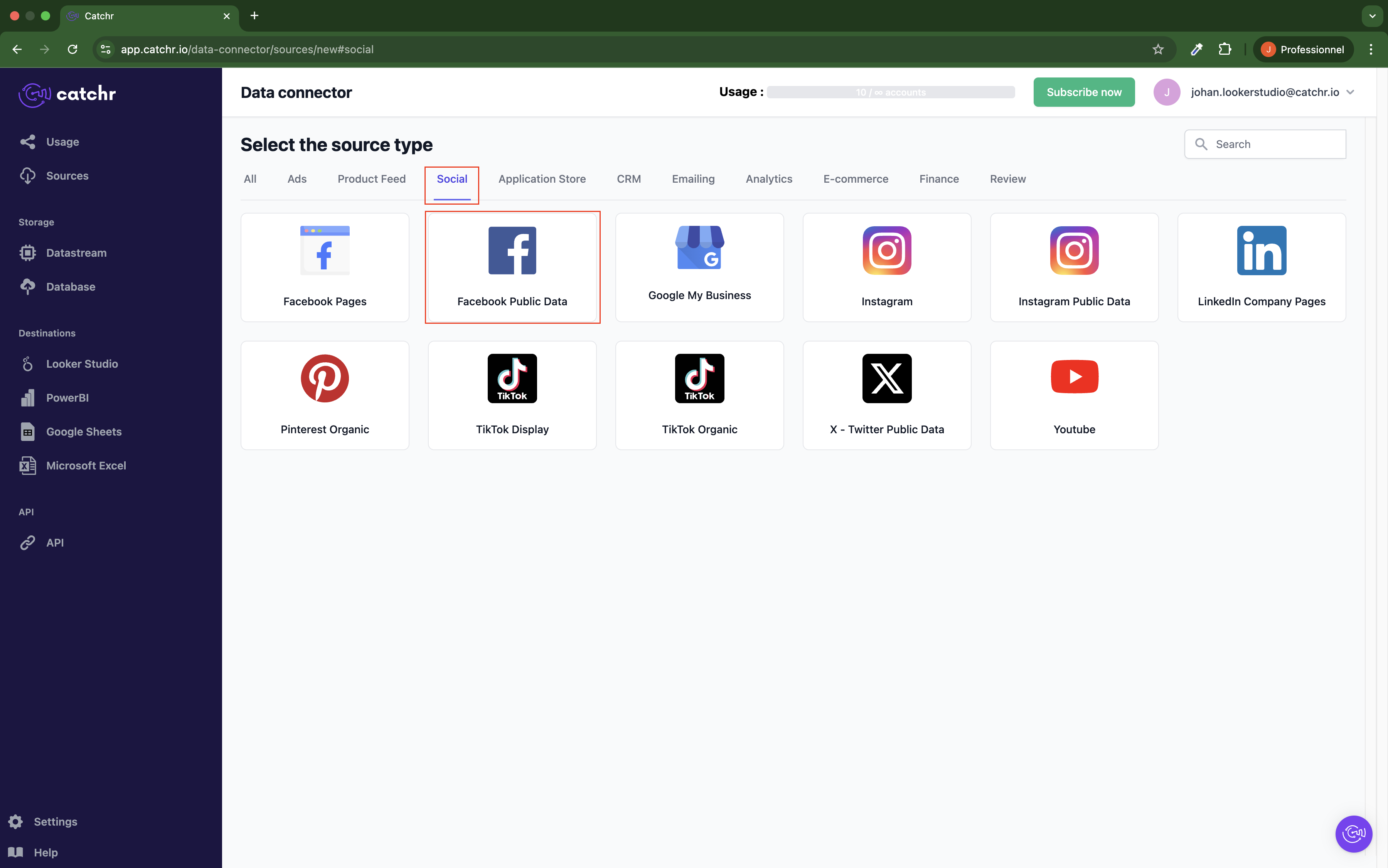 You can now send data from your available accounts to one of Catchr's supported destinations, such as databases or visualization tools like Looker Studio, Google Sheets, Excel, Power BI, or Tableau.