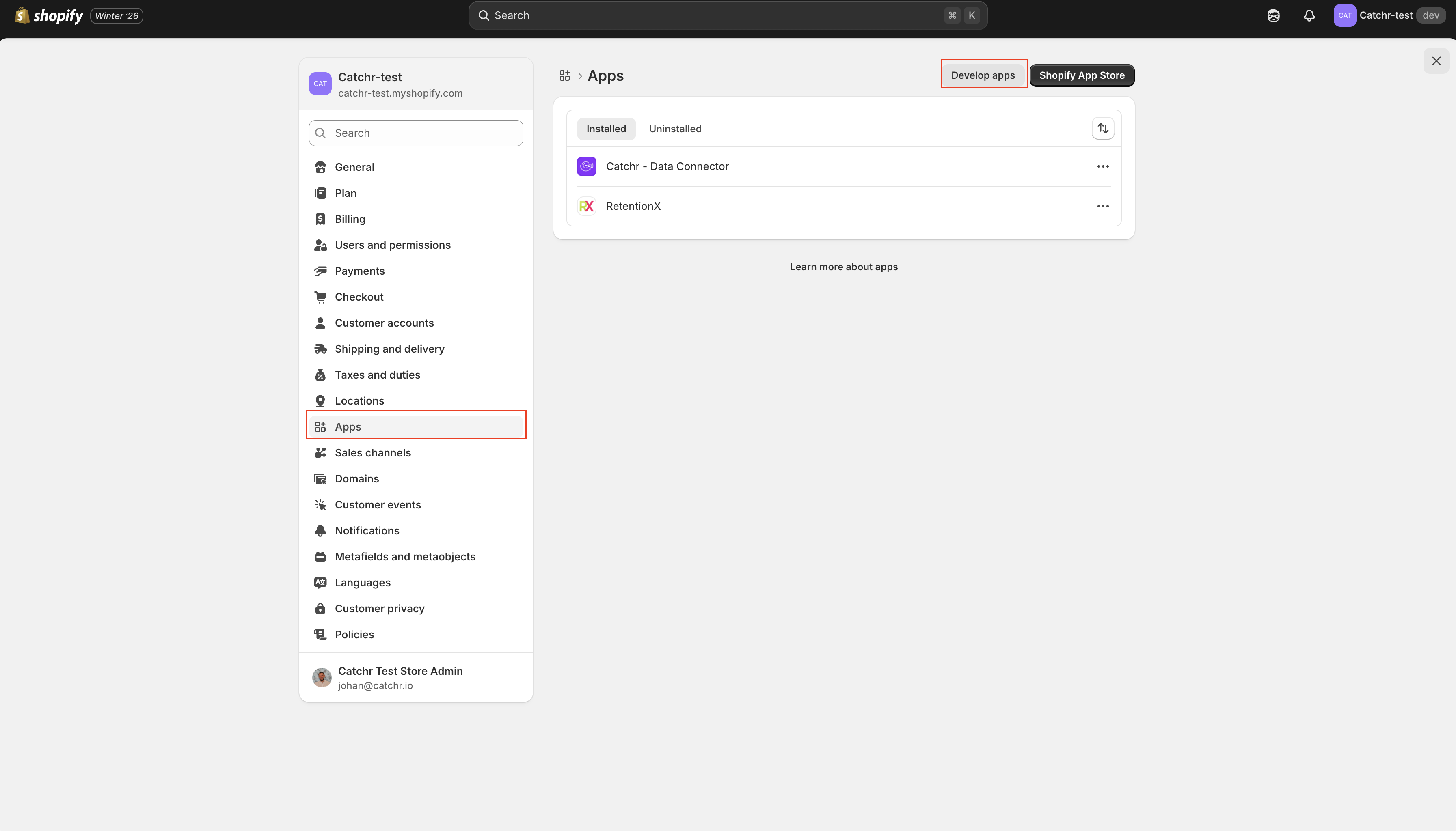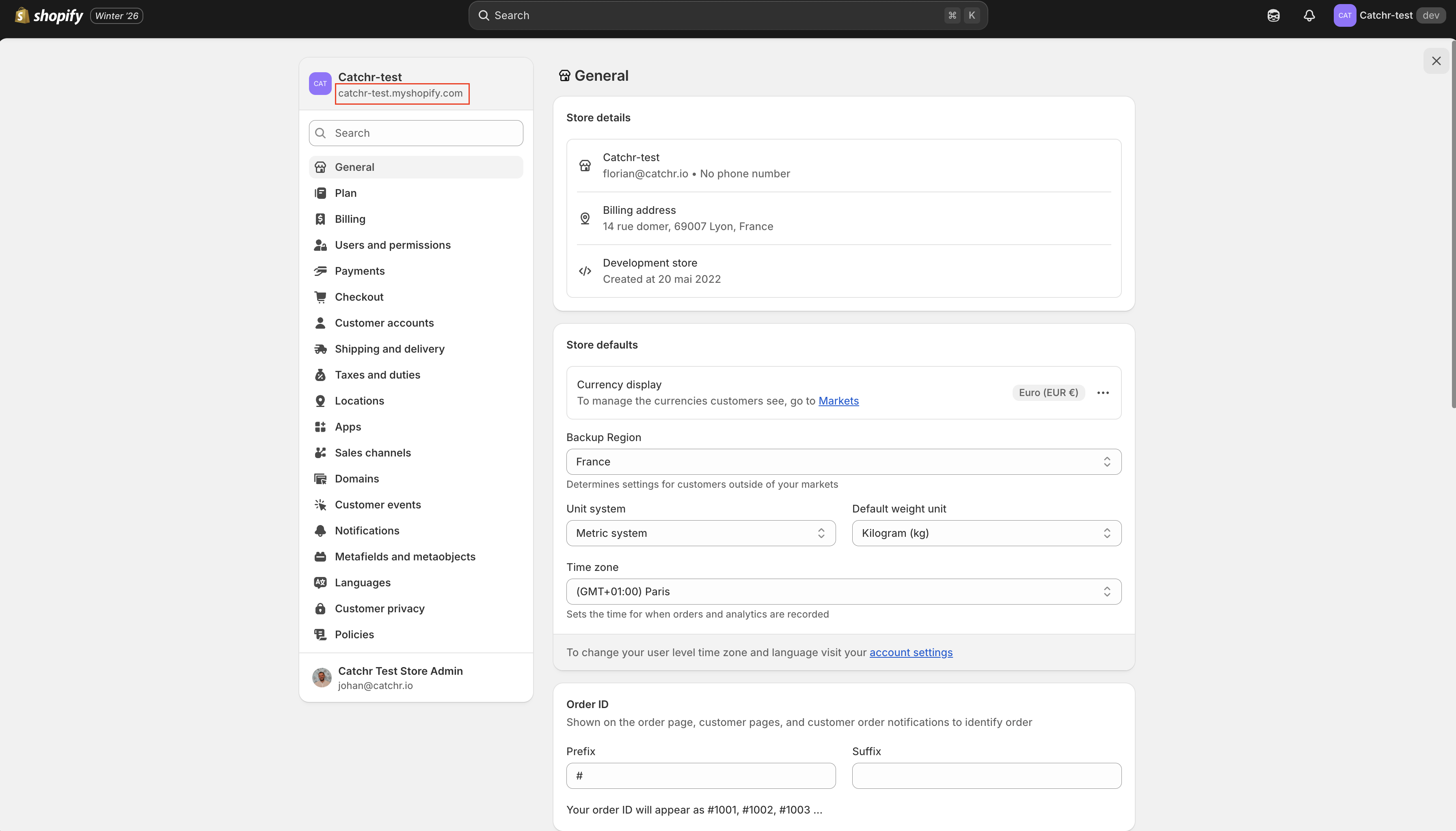 Your Store name is visible on this page (catchr-test.myshopify.com):