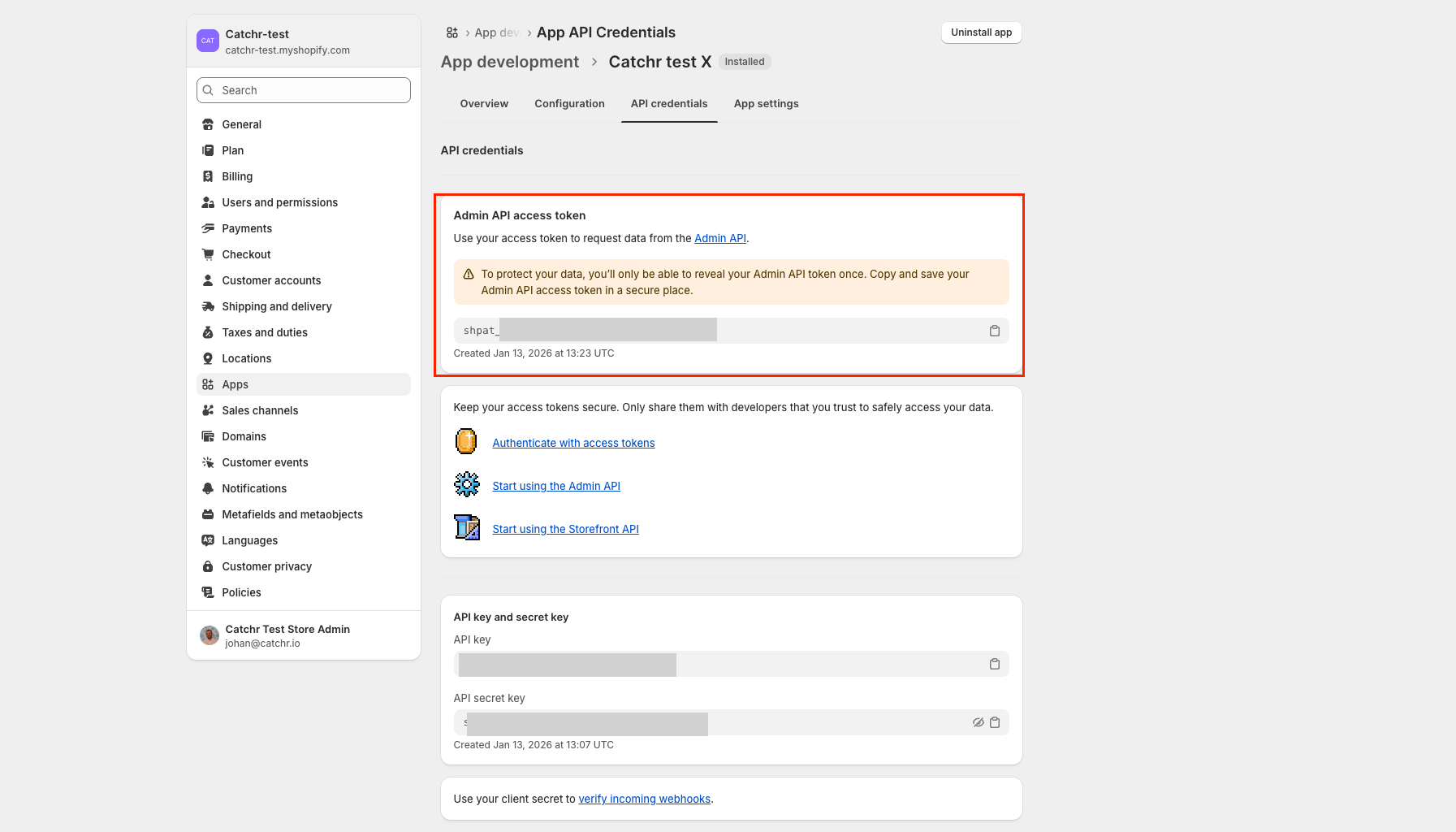 In API Credentails, copy your Admin API access token (you will be able to copy it only once. If you refresh the page, this token won’t be accessible anymore).